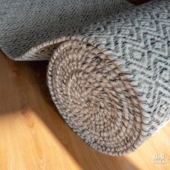 Durable flatweave rug made from 100% wool, using natural and dyed yarn to create a small repeating pattern. Ideal for high traffic areas and family living. Fully reversable for a inverted version of the pattern.